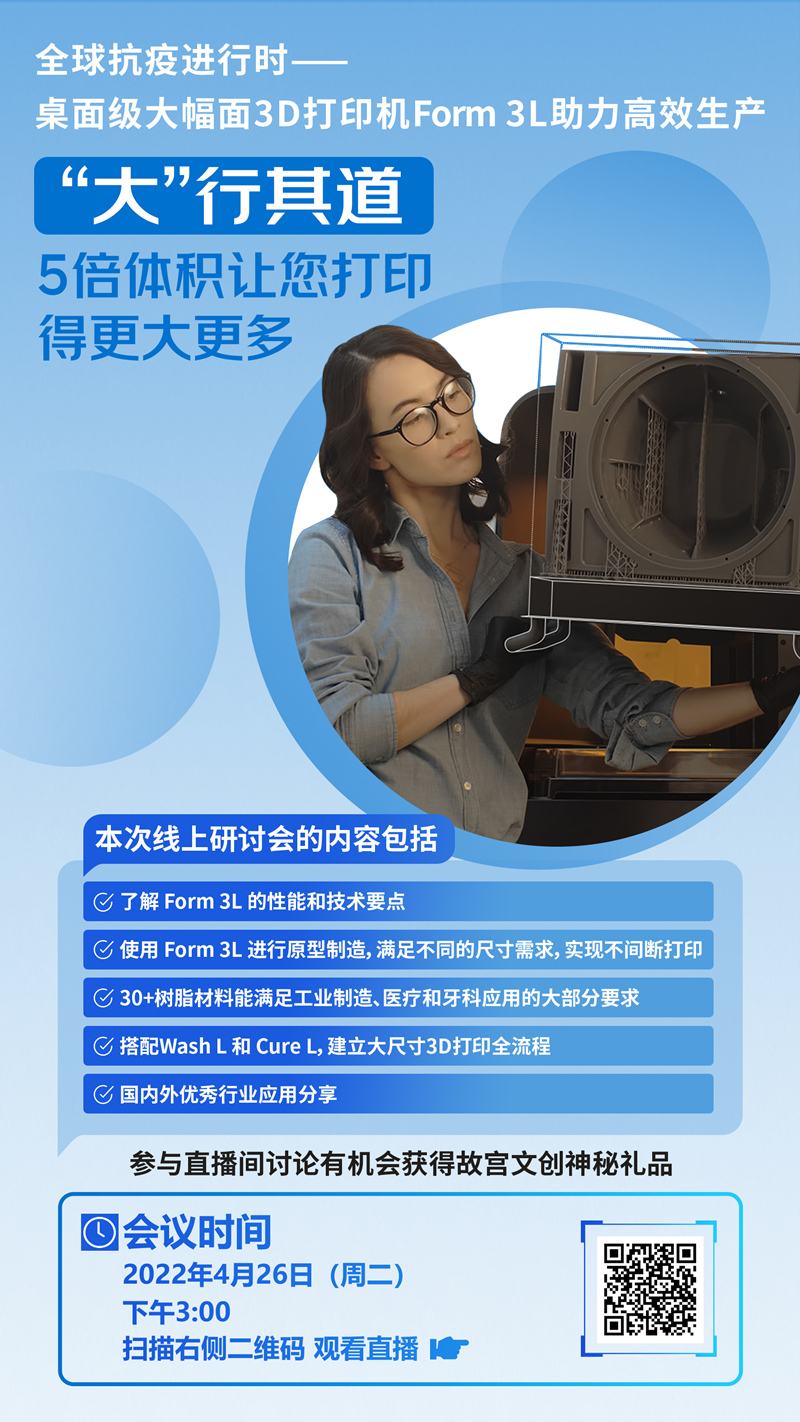 我們誠(chéng)摯邀請(qǐng)您參加本次研討會(huì),F(xiàn)ormlabs 應(yīng)用工程師 Tim Ye 將會(huì)在現(xiàn)場(chǎng)講解Form 3L的工作流程,如何運(yùn)用3D打印進(jìn)行原型制造,以及一些已經(jīng)成功的應(yīng)用案例。